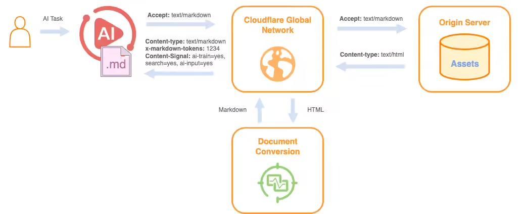 借助 Markdown for Agents 功能,Cloudflare 可将用户的 HTML 网页自动高效地转换为 Markdown,这样 AI 爬取时就无需自行重排,帮助企业在 GEO 浪潮中占据优势。
