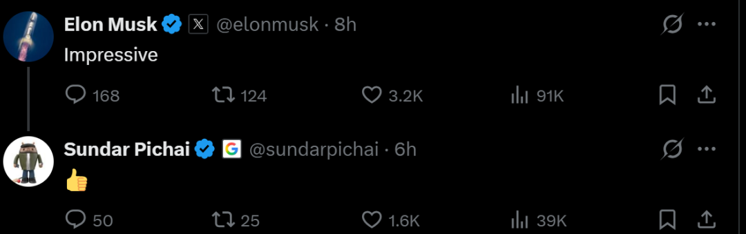 作为谷歌的对手之一,xAI的创始人马斯克都不由得在这条贴文里留下了一句“令人印象深刻”,皮查伊则回复给他一个“大拇指”表情。