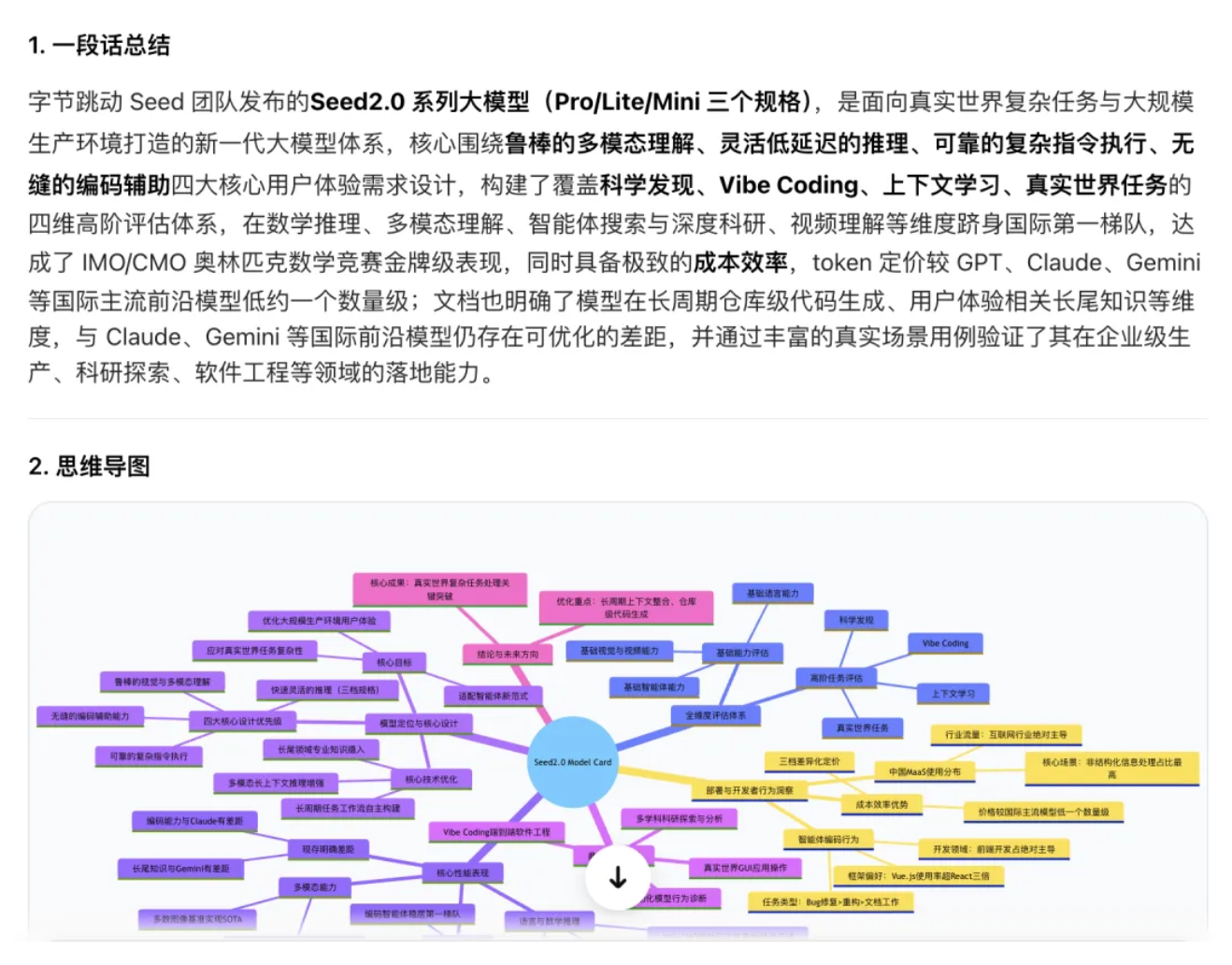 大量的真实用户查询涉及复杂的图片——截图、图表、扫描文档。我试着把一份关于豆包大模型 2.0 自身的技术文档扔给它,要求进行解析。结果没想到,它不仅提取了关键信息,还搭配脑图和 PPT 生成,形成了一整套比较完整的框架。