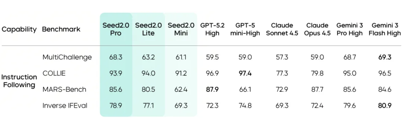 需要注意的是,Seed2.0 系列与国际前沿的大语言模型仍存在差距。Seed 已明确提升模型应对现实世界复杂性的能力方向,并为此在相关方面投入大量精力,对 Seed 模型系列进行优化。