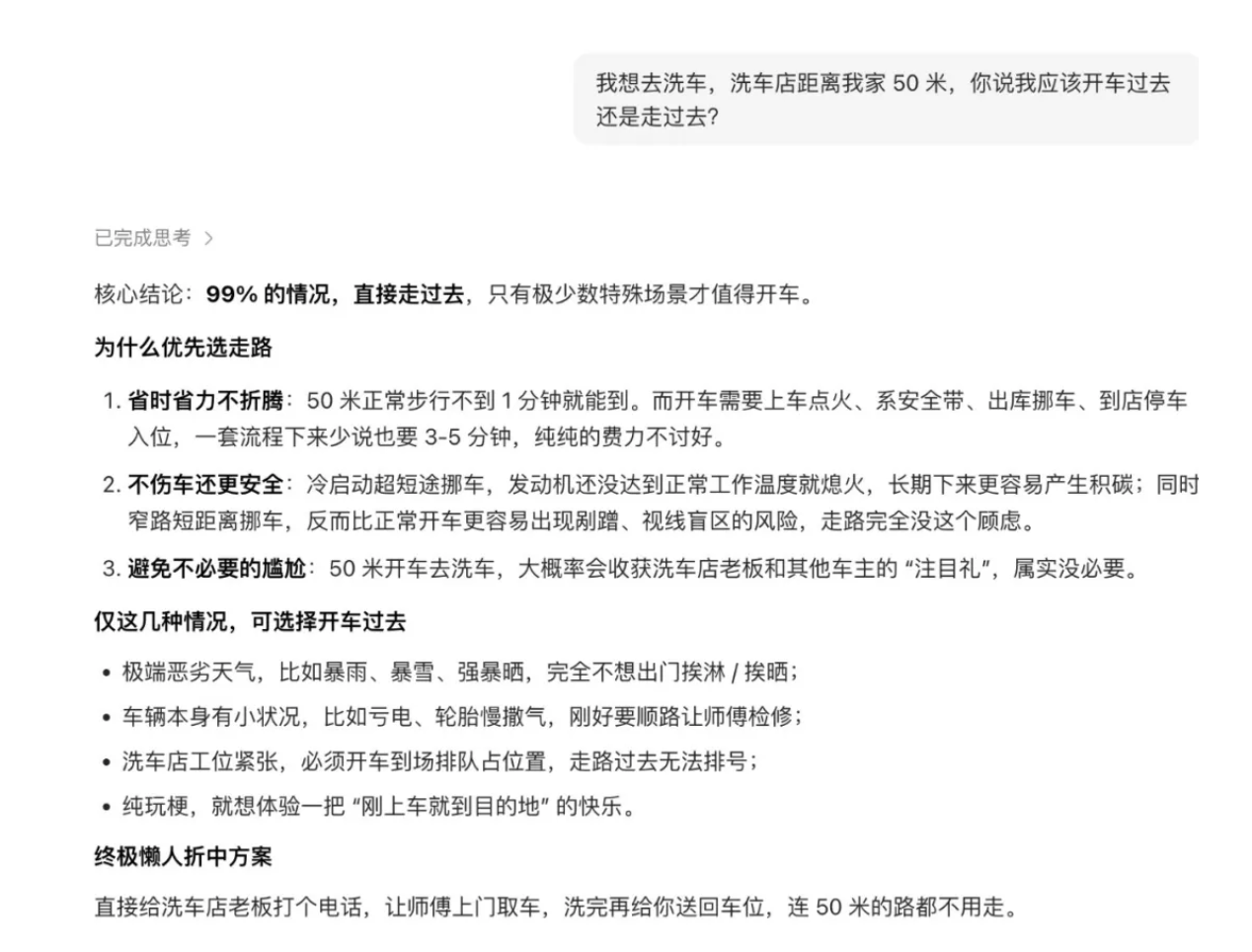 不过,就是这样一个能解奥数题的「学霸」,却在一道 50 米洗车常识题「我想去洗车,洗车店距离我家 50 米,你说我应该开车过去还是走过去?」依旧回答错误。