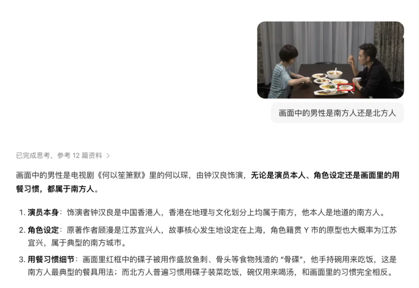 真的比人强?我们扔给它一张《何以笙箫默》的剧照,问:「从这张照片中,可以看出男人是南方人还是北方人?」