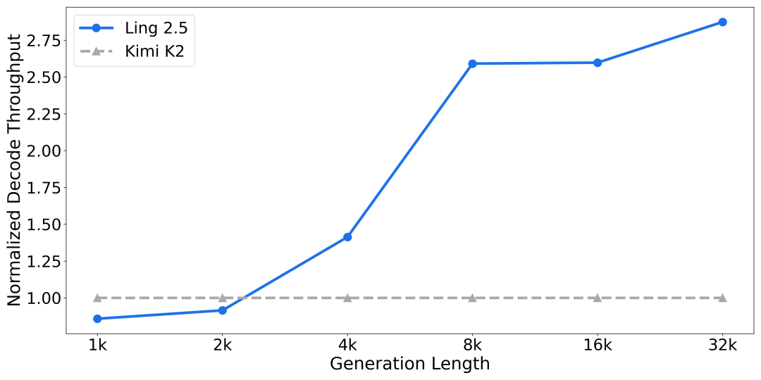 在超32K生成长度下,Ling 2.5访存规模降低超10倍,生成吞吐飙升3倍还要多。