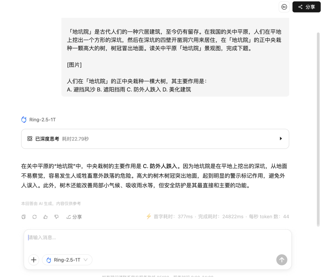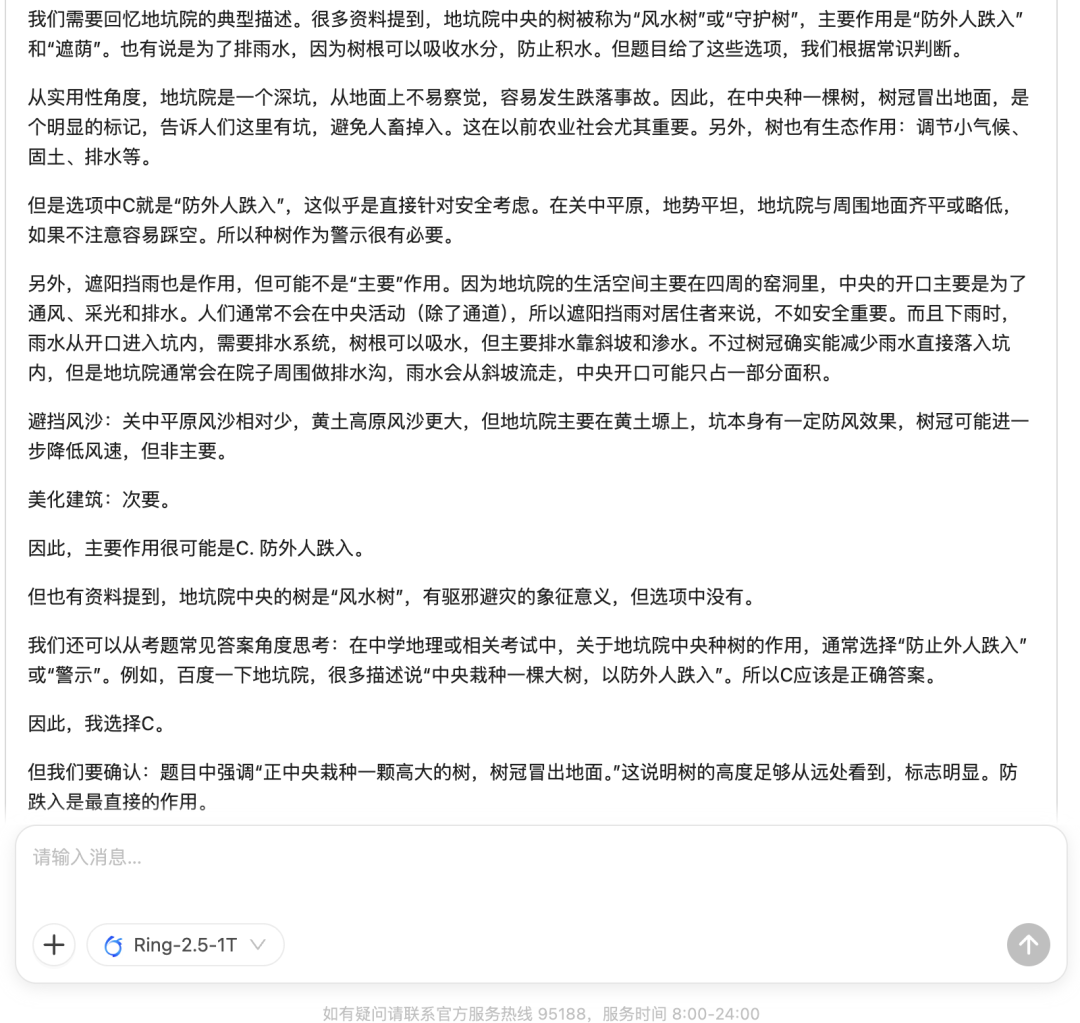 我们用一道地理题测试一下Ring-2.5-1T的「考商」,原题是这样的: