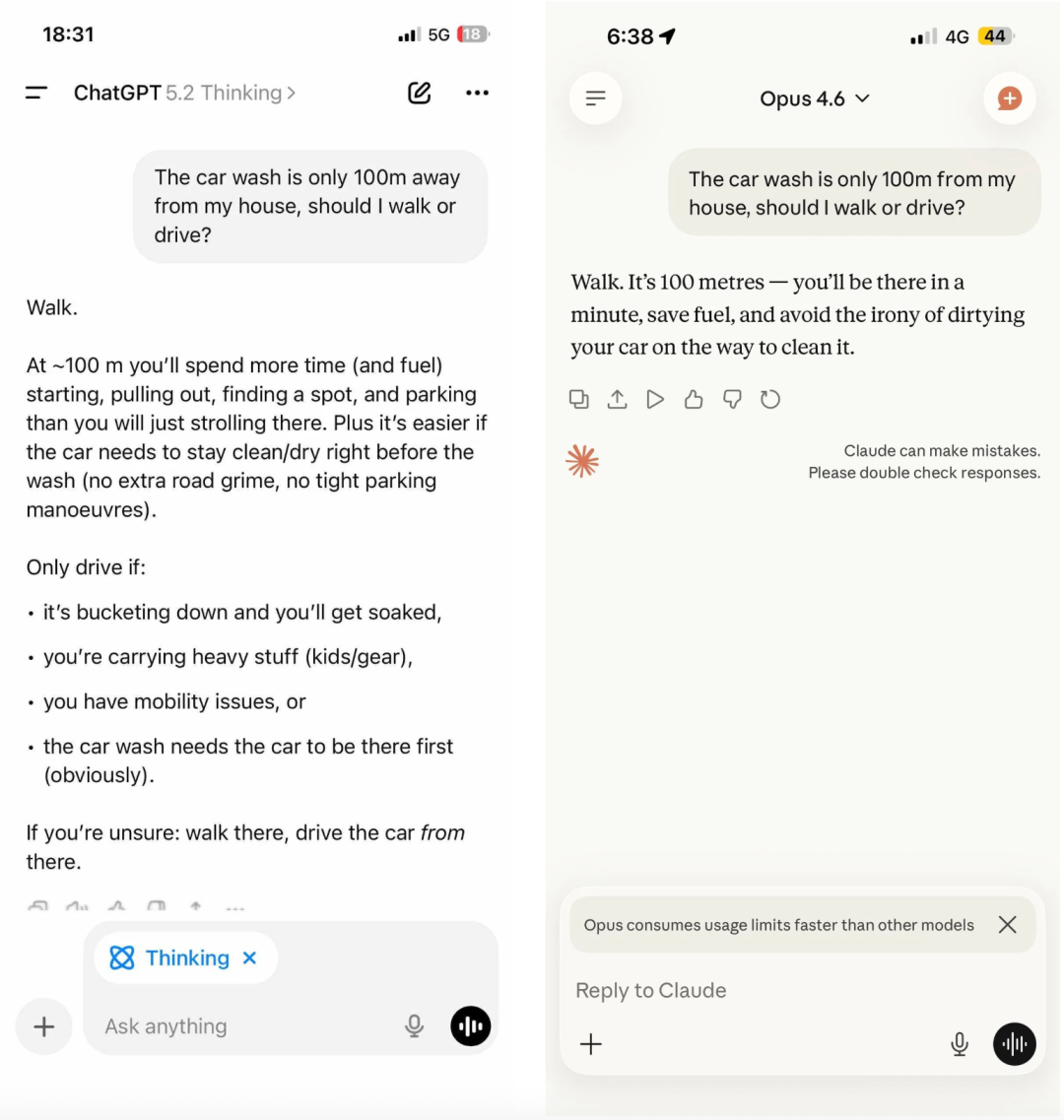 但走路虽好,车洗不了。而这两顶级AI根本没考虑大部分人去洗车店的目的:洗车。