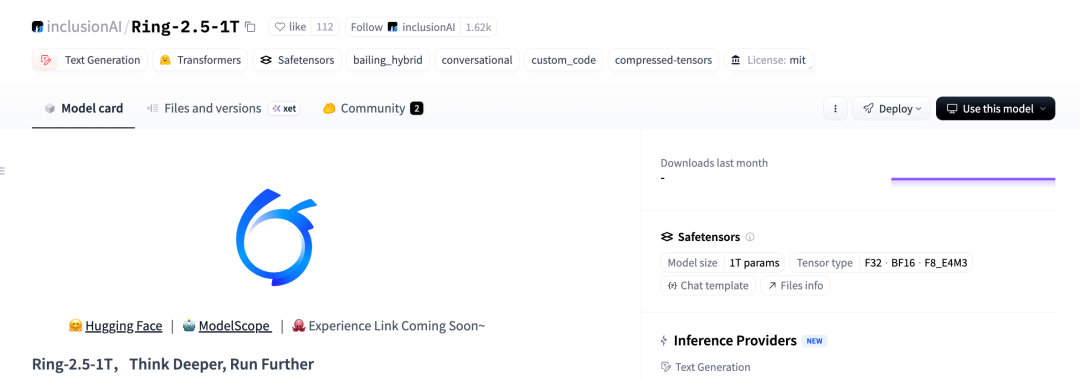 目前,Ring-2.5-1T的权重和推理代码已在Hugging Face与ModelScope上正式上线。