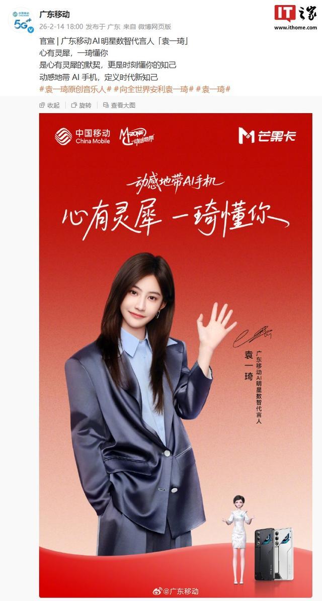 据介绍,该机是广东移动 & 中兴通讯联合首发的 AI 明星数智人手机,搭载记忆进化、数字分身、一语即达、AI 新通信核心能力。广东移动昨日发布海报,官宣了广东移动 AI 明星数智代言人「袁一琦」,预计中兴星悦 70 Ultra 将内置该 AI 明星数智代言人。