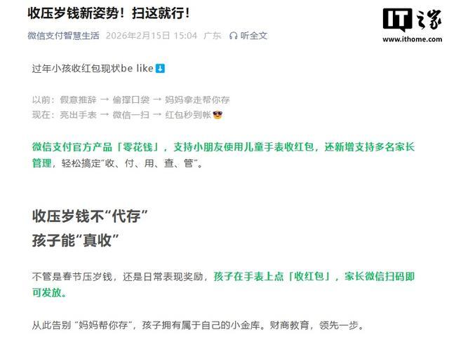 根据微信支付官方说明,该功能允许儿童通过绑定微信支付的智能手表直接收取红包,家长通过扫描儿童手表二维码即可完成红包发放,实现压岁钱“秒到账”。此举改变了传统现金红包需经家长代收代管的模式,使儿童可自主管理个人资金。