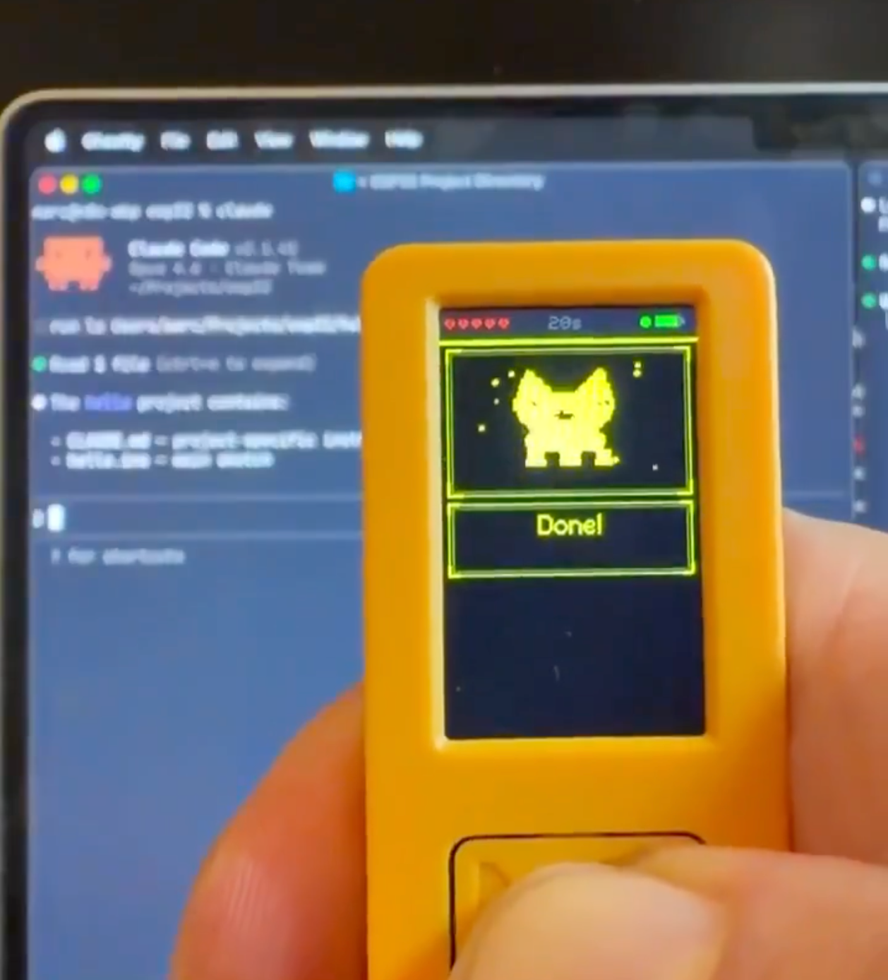 网友把命令行里面跳动的 Claude Code 符号,转到了能够触摸得到的、随身携带的拓麻歌子上。当 Claude Code 在命令行里面思考,或者是问,是否同意执行下面的步骤时,手里的拓麻歌子都会弹出消息来,指示我们下一步操作。