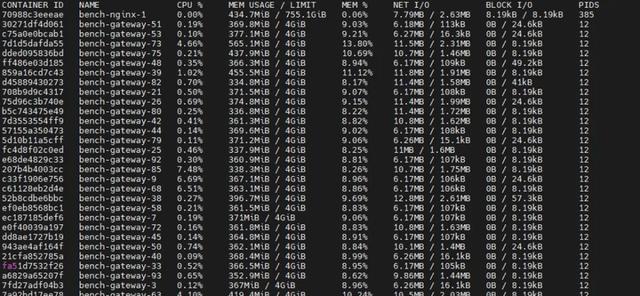 展示各容器CPU、内存、网络I/O等资源使用情况,所有容器均正常运行