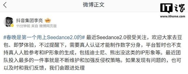 2 月 15 日,抖音集团副总裁李亮在社交平台发文称,“最近 Seedance 2.0 很受关注,欢迎大家去豆包、即梦体验,不过提醒下,需要真人认证才能制作数字分身,平台暂时也不支持真人人脸参考和 IP 形象的生成,包括迪士尼、熊出没这类的 IP 形象等。最近团队投入最多的一件事就是不断维护和加强反侵权策略。如果发现有问题的,也可以及时和我们反馈,我们会跟进处理收起。”