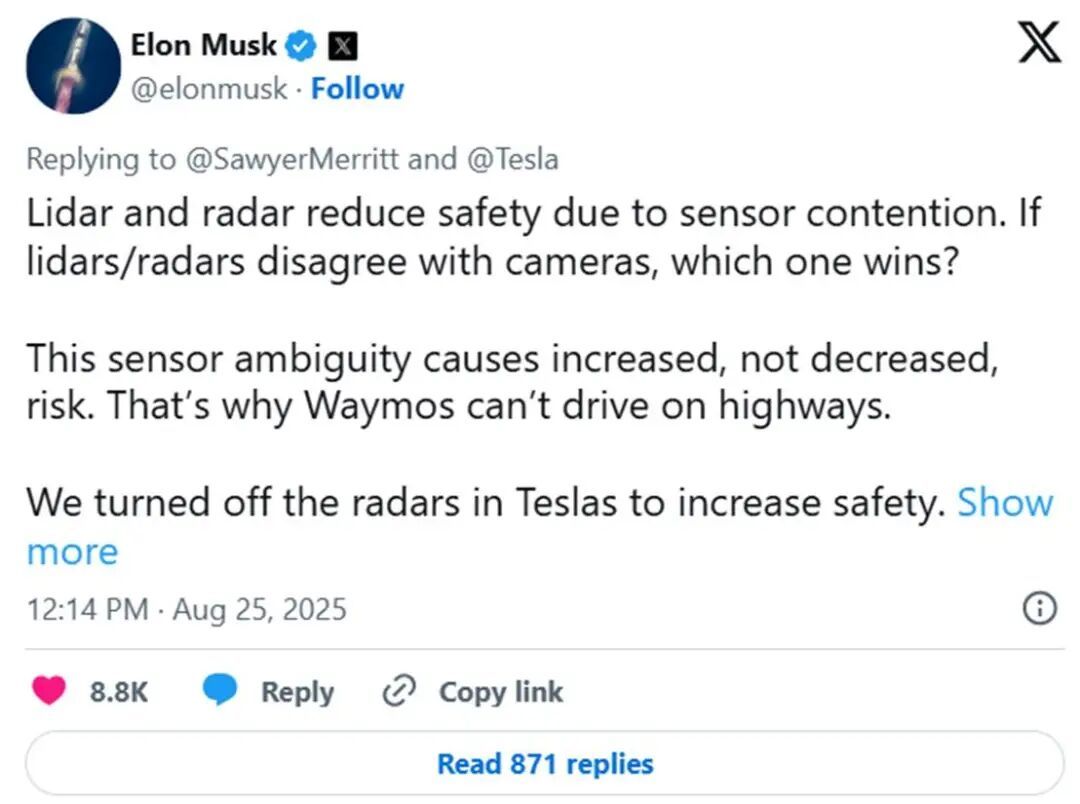 而另一边,特斯拉孤军奋战,大胆而有争议地押注于单一模式——纯粹的、基于摄像头的视觉。