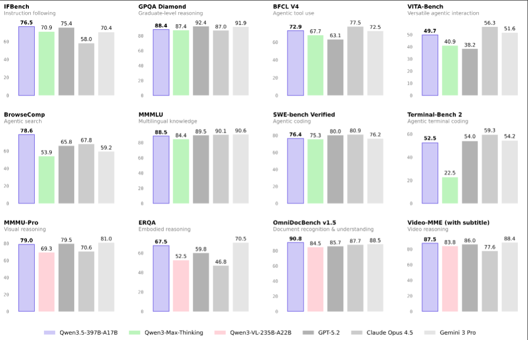 官方数据显示,Qwen3.5-Plus只用了不到3970亿参数,激活仅170亿,性能就超过上一代万亿模型Qwen3.0-Max。