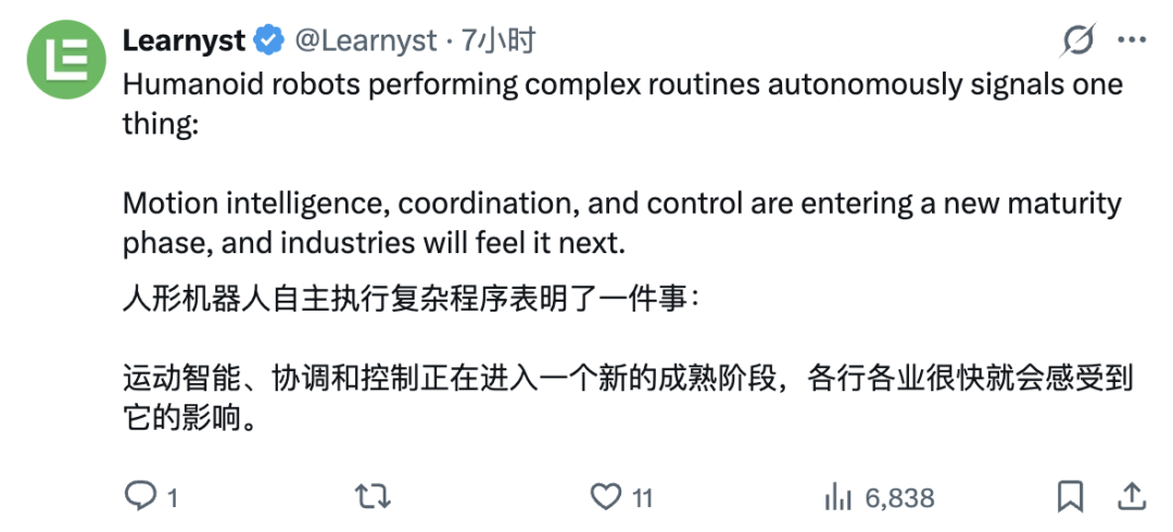 对此,科技博主 @Learnyst 表示:「人形机器人能够自主完成复杂动作,说明了一件事:运动智能、协同能力和控制技术正进入一个更加成熟的新阶段。」