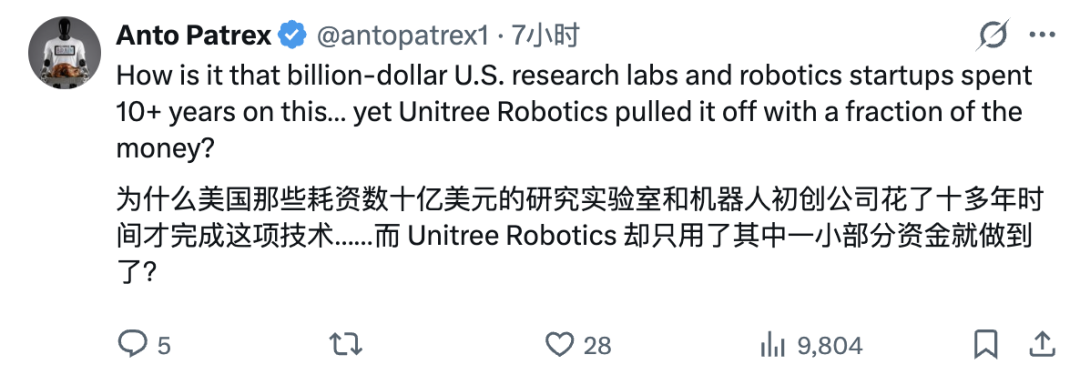 「为什么美国那些投入数十亿美元的研究实验室和机器人初创公司花了十多年时间研究这项技术……而 Unitree Robotics 却用远少得多的资金就实现了?」