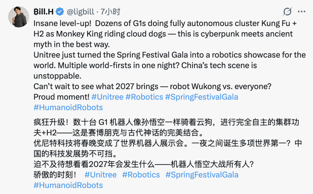 网友 @ligbill 更是激动到语无伦次:「疯狂升级!这是赛博朋克与古老神话的完美融合。迫不及待想看看 2027 年会带来什么——机器人悟空对战全世界?」
