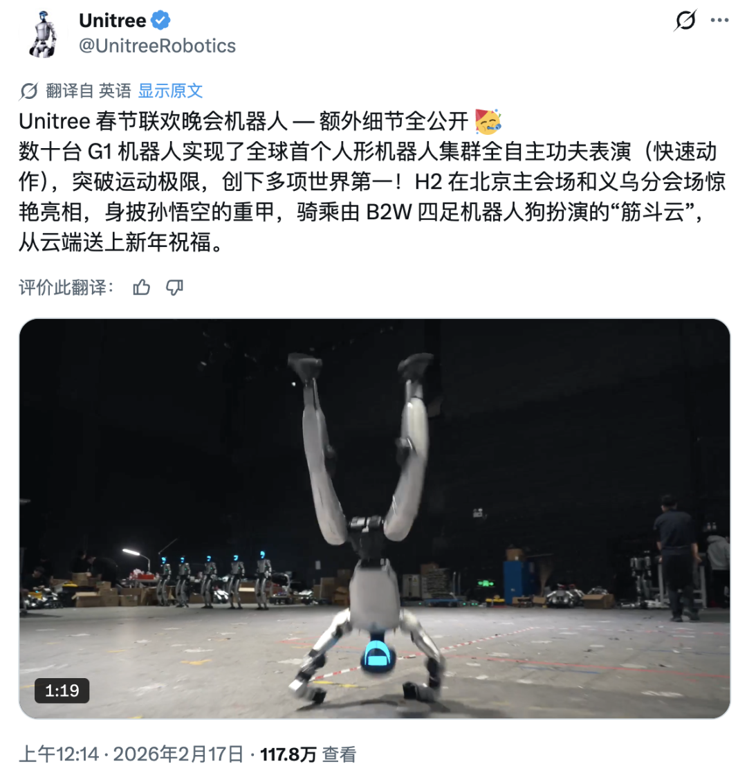 当身披金甲的 H2 机器人,手持金箍棒,踩着由一群机器狗组成的「筋斗云」丝滑入场、当一堆宇树 G1 机器人大秀武术后,一大堆切片视频正在海外社交媒体疯传。