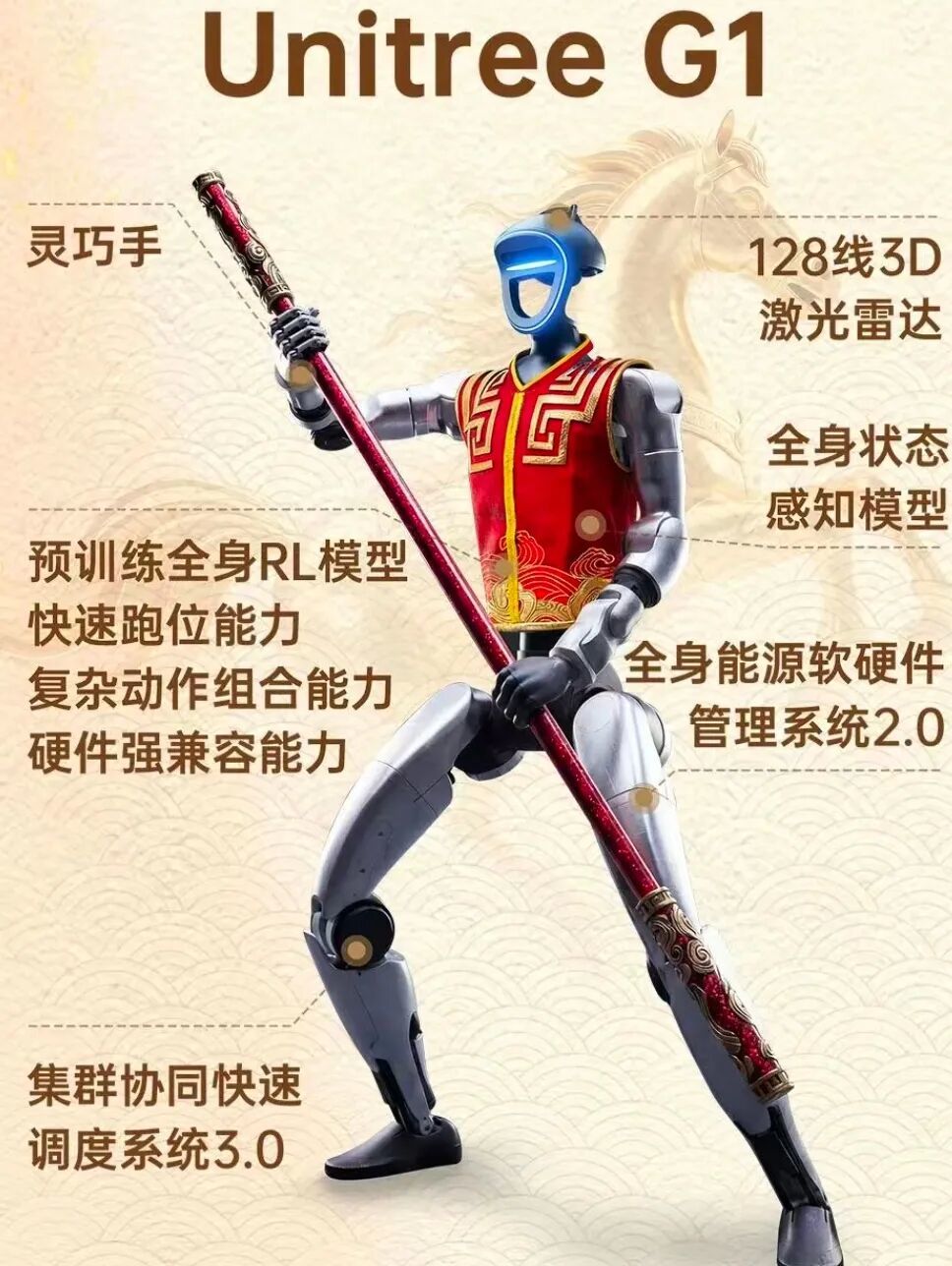 并且搭载全新自研灵巧手,支持武术道具的快速更换与稳定抓持