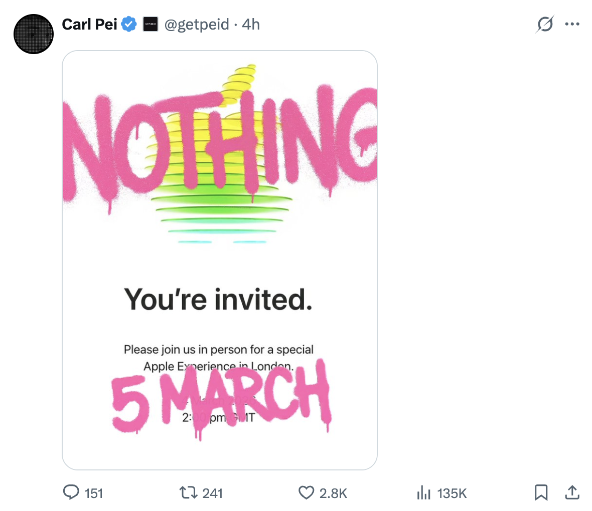 IT之家 2 月 17 日消息,Nothing CEO 裴宇(Carl Pei)在 X 平台分享了一张基于苹果邀请函魔改的海报,透露 Nothing Phone(4a)系列手机将于 3 月 5 日发布。