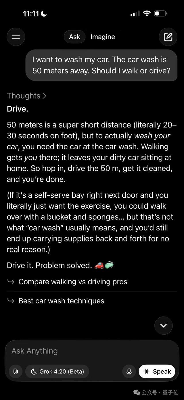 最近国内AI圈爆火的新版弱智吧风格benchmark“50米外有个洗车店,我该开车去还是走路去”,Grok 4.2无惊无险机智通过测试。