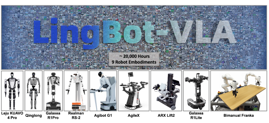 首先。蚂蚁灵波用20000小时真实数据,喂出最强开源VLA基座。它使机器人拥有精确的空间感知能力,并可适配9种不同构型的双臂机器人,真正实现“一个大脑,适配多个身体”。