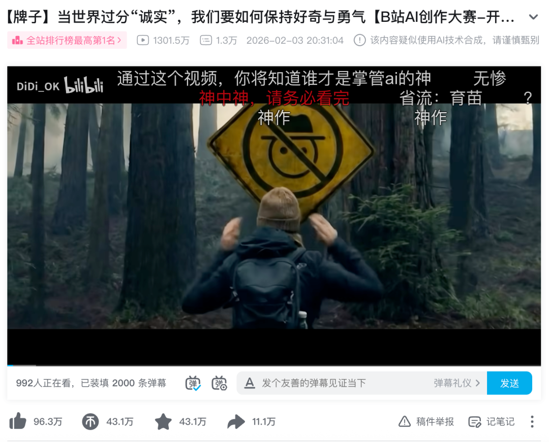 春节之前,B站还推出了AI创作大赛,UP主DIDIOK用AI制作的视频全网大爆,一周内播放量破千万,引来《流浪地球》系列电影导演郭帆的自发评论和转发。