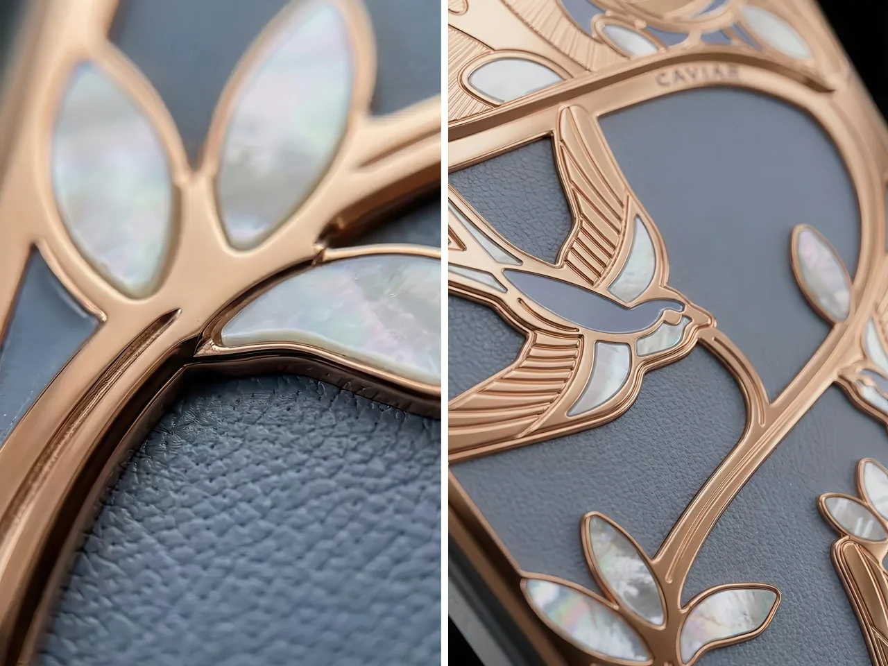 设计团队在皮革之上,利用 24K 玫瑰金与珍珠母贝,精细雕琢出燕子穿梭于藤蔓与叶片间的生动场景,并在每一片叶子的尖端镶嵌彩虹色的贝壳,像是一幅陈列于博物馆玻璃后的微型新艺术派浮雕画板。
