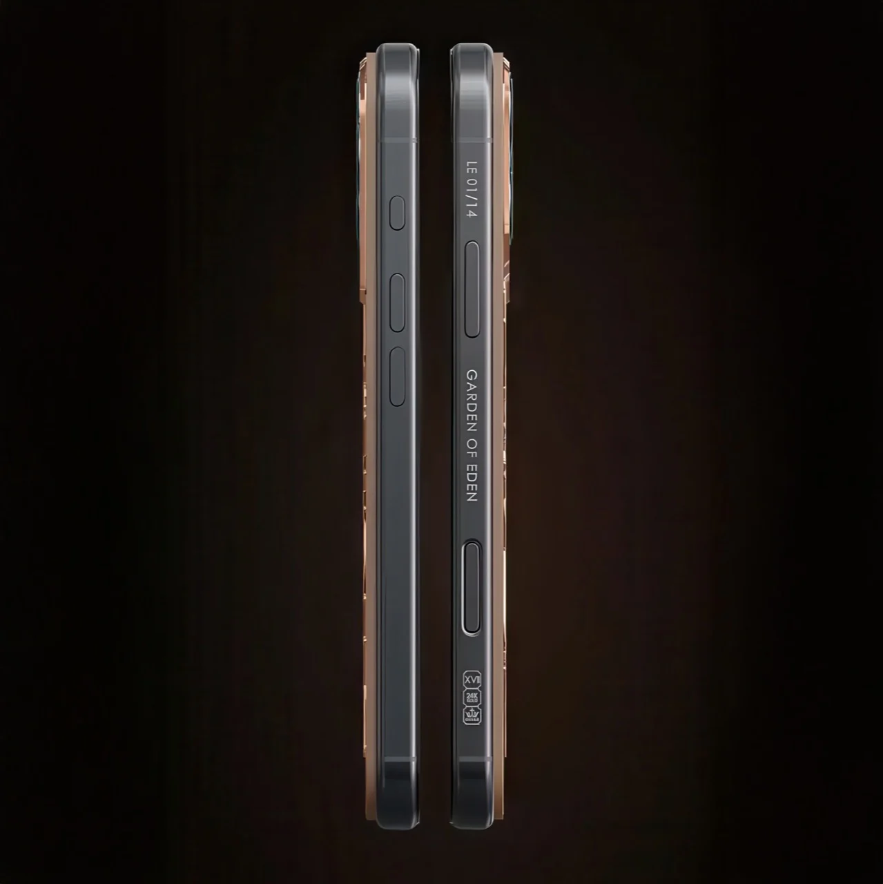 机身侧面雕刻有“Garden of Eden”字样及独立的限量编号,底部边缘则印有认证 24K 黄金含量的标志,进一步强化了其作为珠宝首饰的属性。