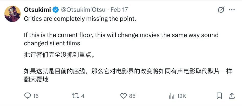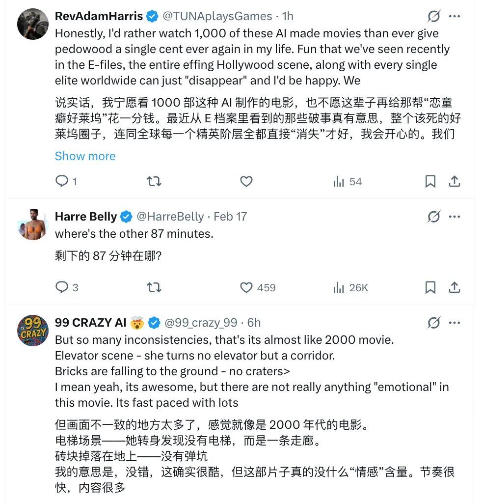 还有一类掺杂着对好莱坞体制的厌倦、对 AI 的期待、以及各种说不清楚的情绪的声音。有人说宁愿看一千部这样的 AI 电影,也不给好莱坞一分钱。这当然是气话。