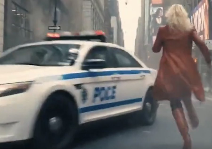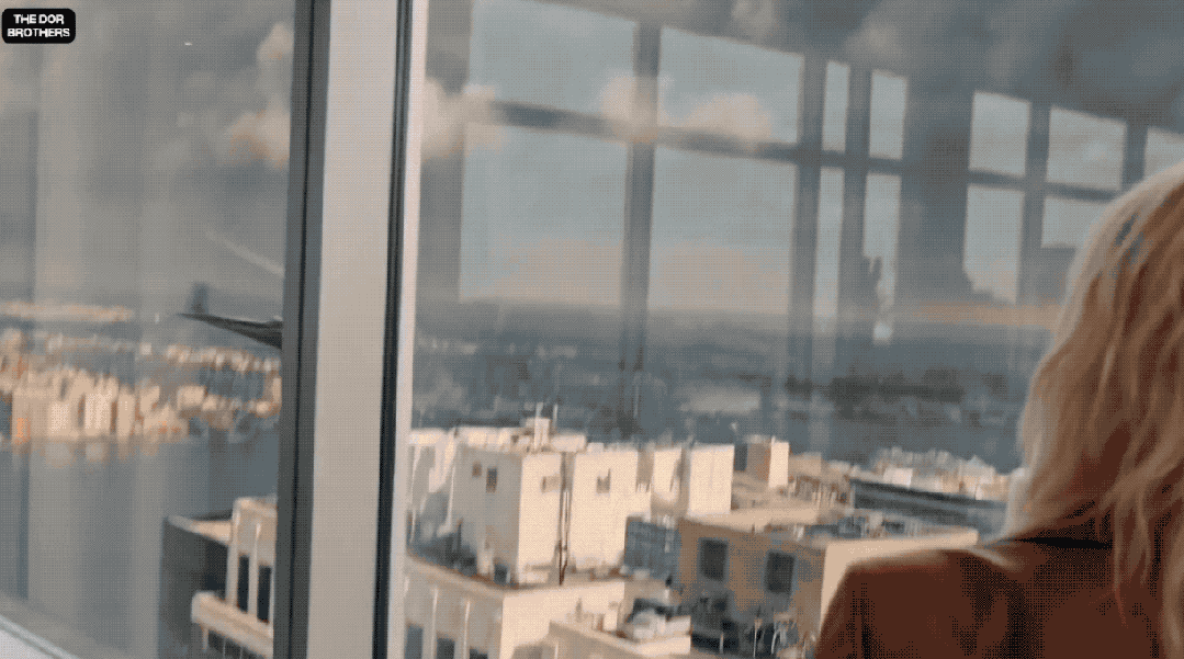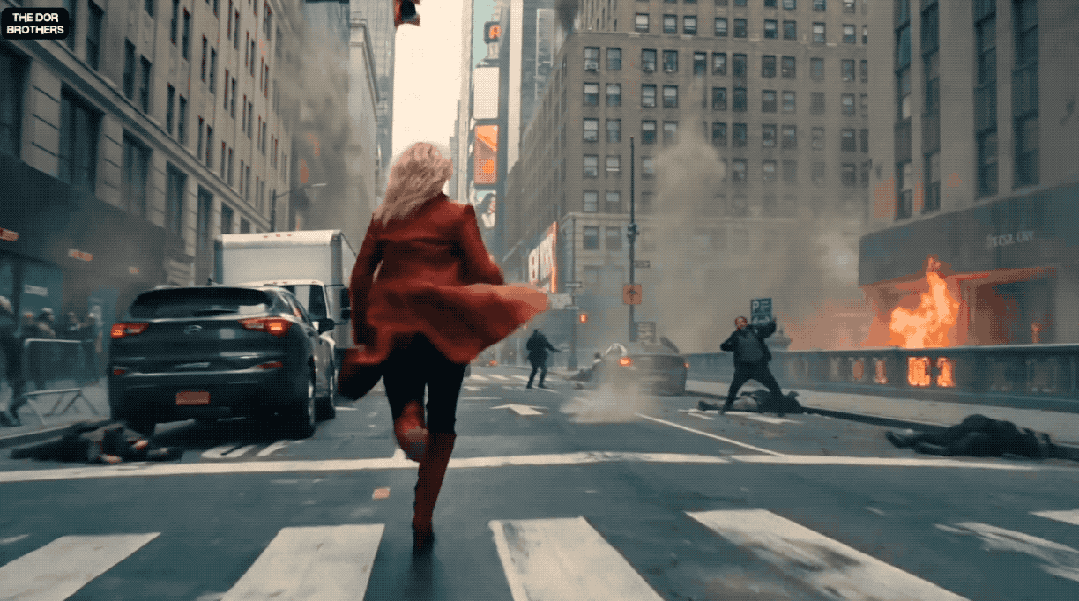 画面里,一位身穿亮红色外套的金发女子站在高层办公室落地窗前,俯瞰着城市陷入混乱。直升机盘旋坠落,爆炸撕裂街道,汽车翻滚燃烧,人群四散奔逃……