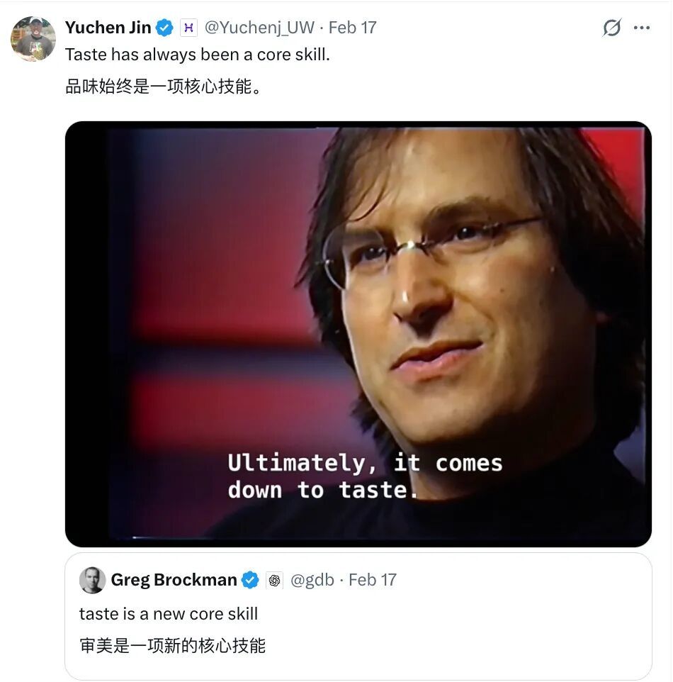 OpenAI 联合创始人 Greg Brockman 说:「taste is a new core skill(审美是一项新的核心技能)。」Yuchen Jin 回应:「Taste has always been a core skill(审美始终是一项核心技能)。」