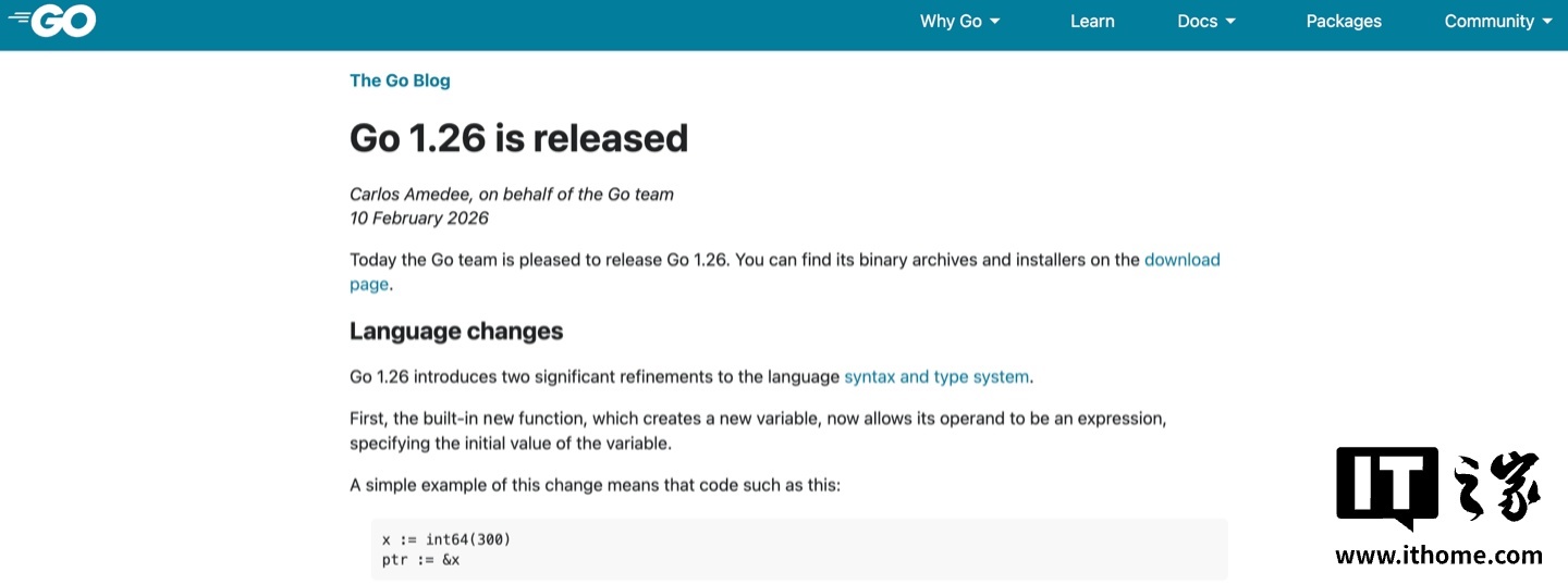 IT之家 2 月 19 日消息,Go 语言团队现已正式发布 1.26 版本,本次更新主要改进泛型规则,同步提升运行性能。