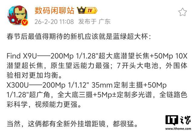 IT之家 2 月 20 日消息,博主 @数码闲聊站 今日发文称“春节后最值得期待的新机应该就是蓝绿超大杯”,并分享了两款新机的部分规格。