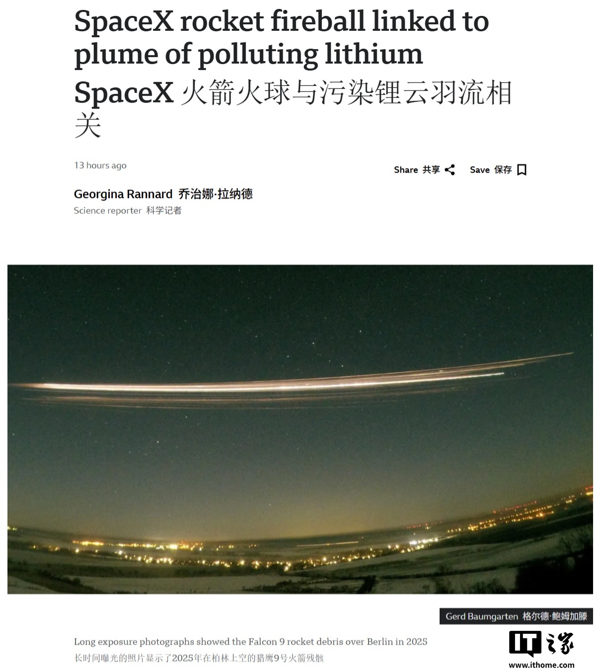 IT之家 2 月 20 日消息,德国莱布尼茨大气物理研究所团队于 2026 年 2 月 19 日发布研究成果,首次成功测量了火箭重返大气层时产生的污染羽流。