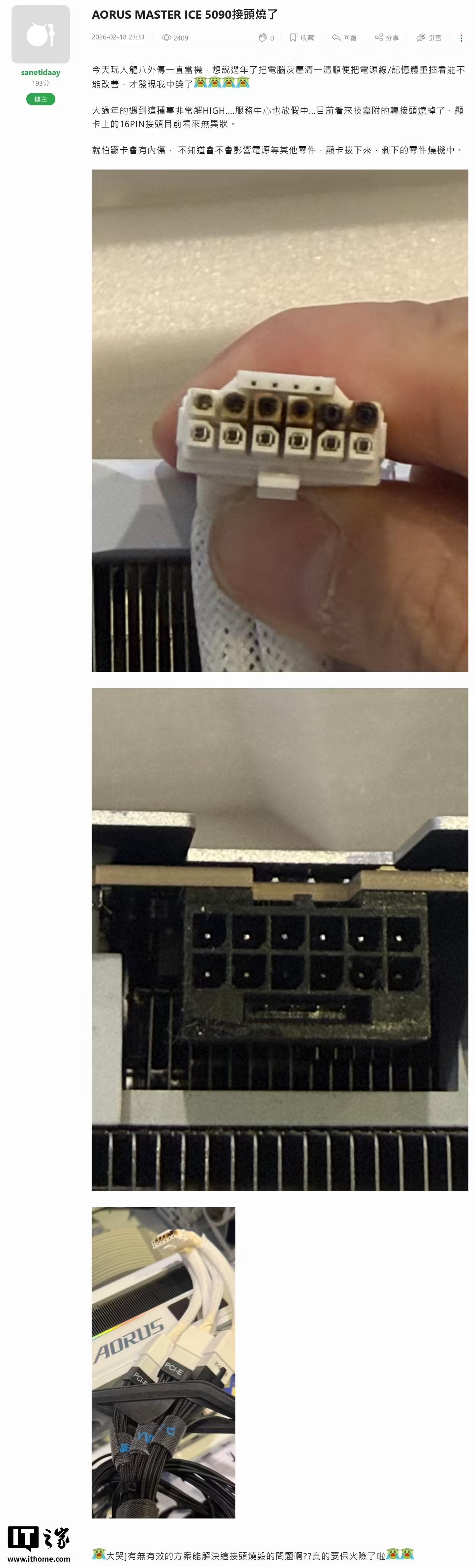 IT之家 2 月 20 日消息,网友 @sanetidaay 昨日(2 月 18 日)在 mobile01 论坛发帖,反馈其技嘉 RTX 5090 AORUS Master ICE 显卡发生 12V-2×6 电源接口熔毁事故。