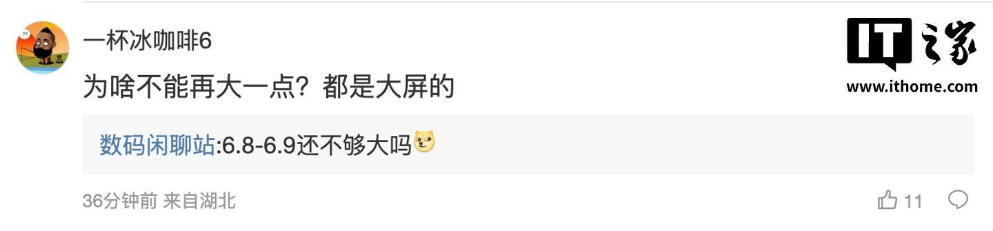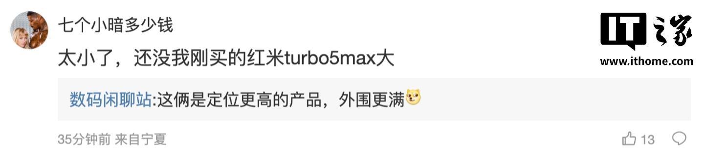 后续有用户在评论区询问:“太小了,还没我刚买的红米 turbo5max 大”,博主回复道:“这俩是定位更高的产品,外围更满 [狗头斜眼]”;另一名用户则询问道:“为啥不能再大一点?都是大屏的”,博主则表示:“6.8-6.9 还不够大吗 [狗头斜眼]”。