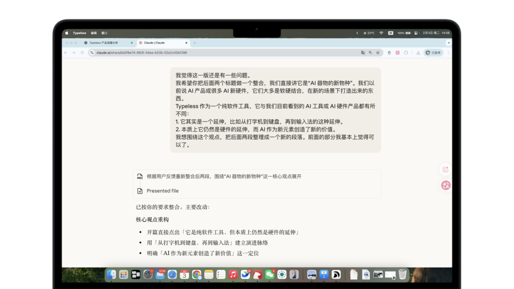 但现在我们有 Typeless,只要把听写打开,我们可以从头到尾一句一句提修改意见,并根据文段补充相应的观点和叙述。