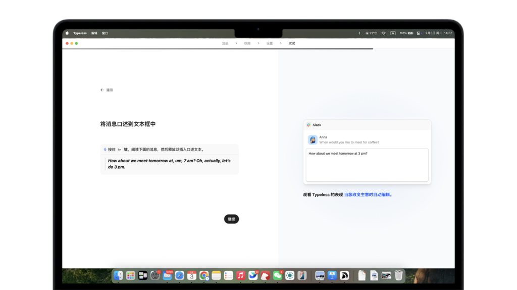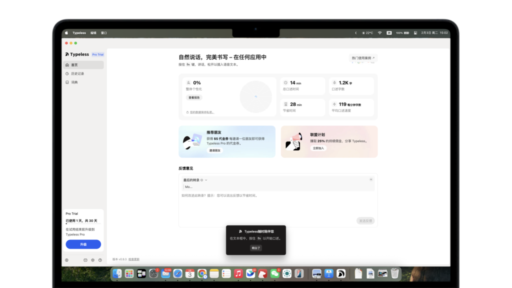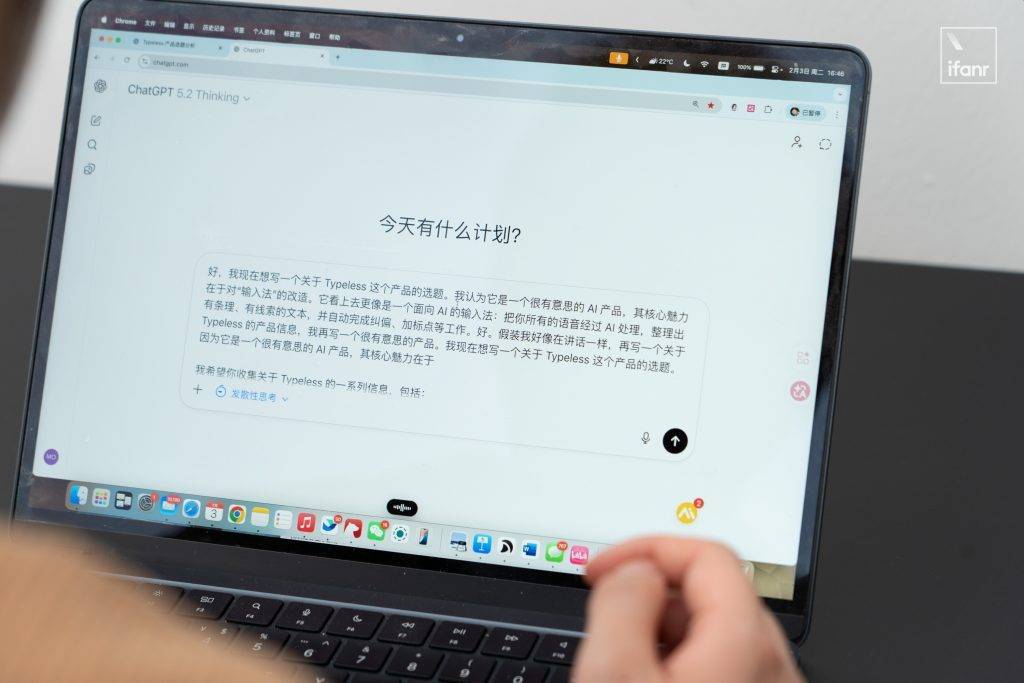 我很喜欢 Typeless 的在设备上全局的集成形式——手机上是输入法,电脑上是热键,让它可以像 AI 助手一般跨应用使用,这是 ChatGPT 无法给出的细节体悟。