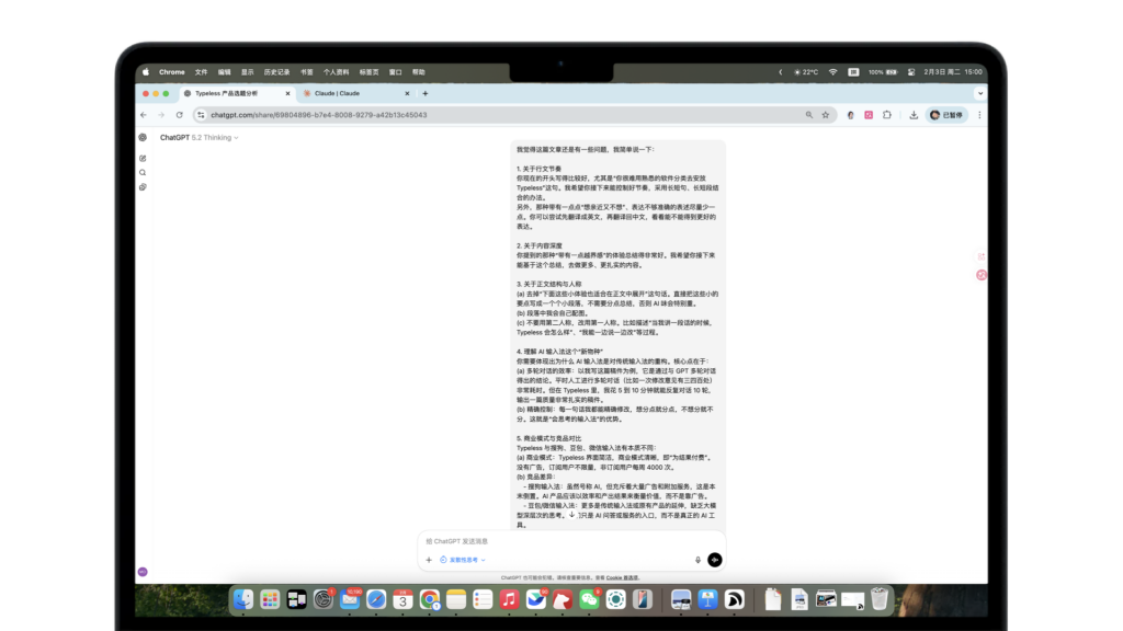整个过程还挺有意思,一开始我们只是想测试用 Typeless 和 ChatGPT 进行写稿的过程,但随着一轮一轮的对话深入,稿子不断打磨,最终出来了一篇观点明确的文章,不仅行文流畅,AI 味也很少。