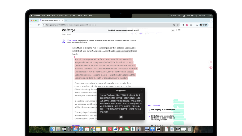 但进一步探索使用之后,我觉得我还是狭隘了。在这个 AI 时代下,Typeless 不应该只是一个独立的 App,更应该成为一种「标配」无处不在。