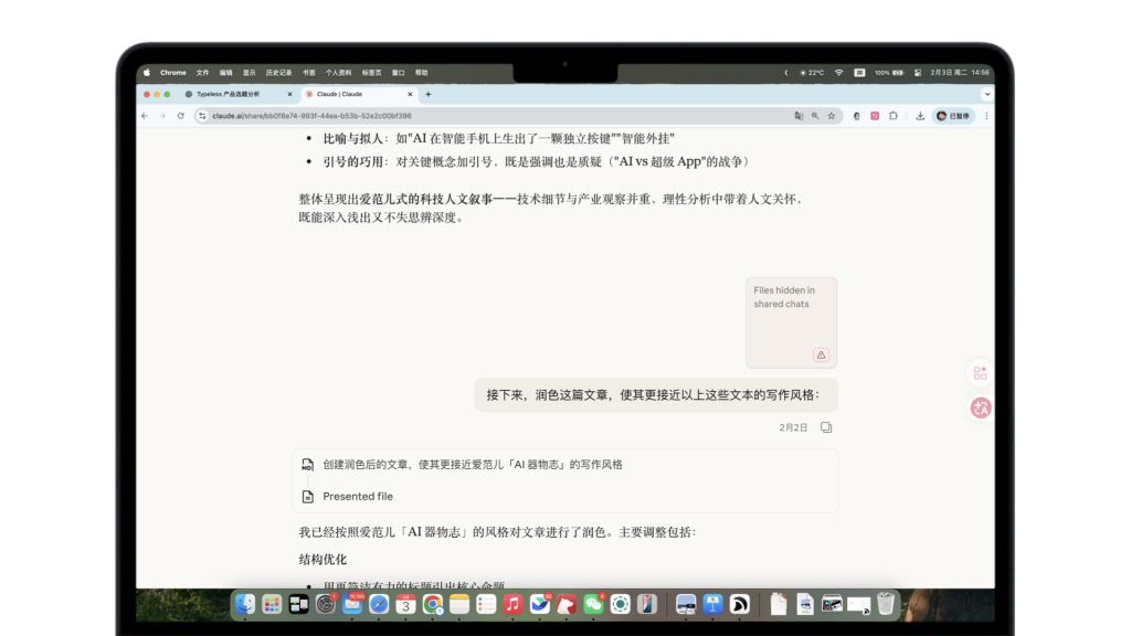 它也有副作用。用它跟同事沟通时,偶尔会显得过于干净,像把语气里的缓冲都删掉了。对方会觉得不够有人味。会在这种场景里切回普通输入法,手动敲几句更口语的句子,补一个表情,或者加一段无意义的笑声。这不是 Typeless 的问题,而是它的真实位置——它最自然的场景是与 AI 沟通,不是与人闲聊。