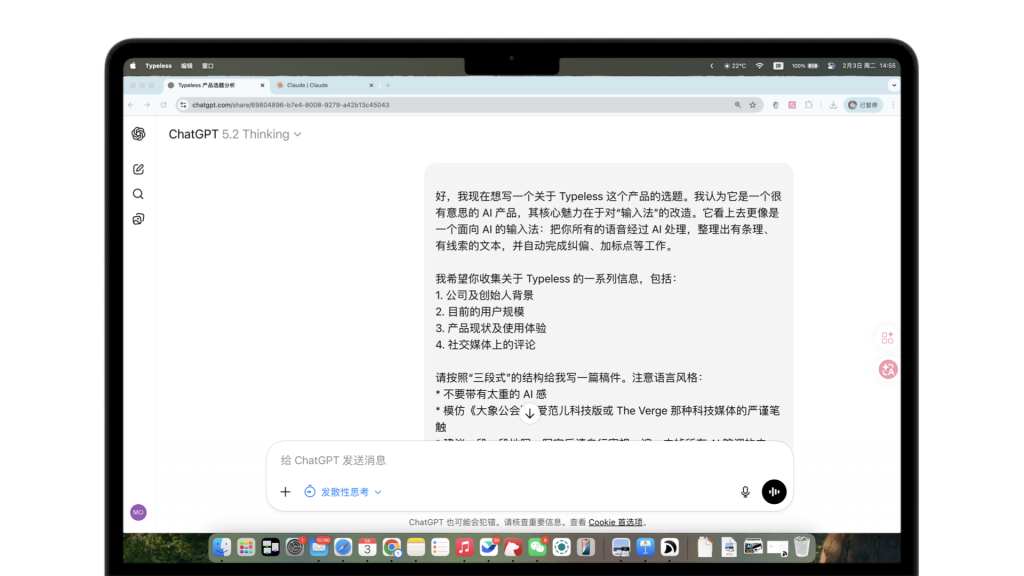 一开始,我们先抛出了一些初步的想法,关于 Typeless 这个产品的一些观点,以及资料收集和写作注意事项,这些「意识流」的口述被 Typeless 整理成条理清晰的文字,直接用作 ChatGPT 的提示词。