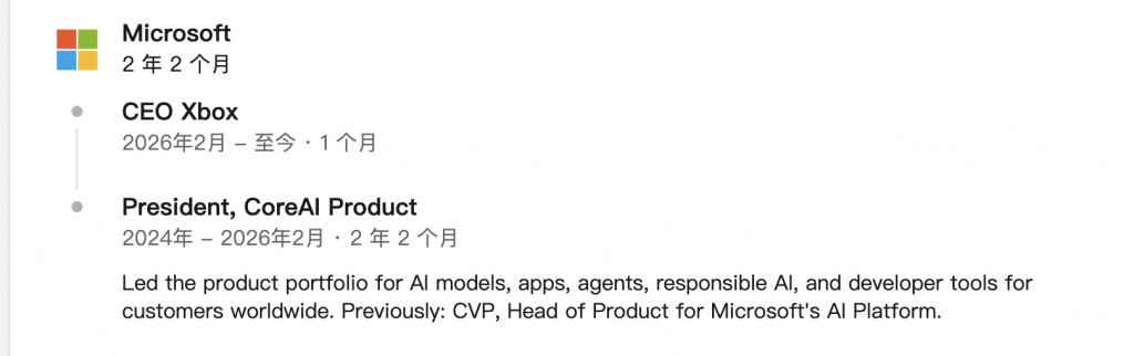 接手游戏部门之前,Asha Sharma 主要负责 AI 业务,担任微软 CoreAI 产品总裁,也在 Meta 出任过领导岗位。纵观她的履历,微软游戏业务 CEO 是她第一个和「游戏」有关的职务。