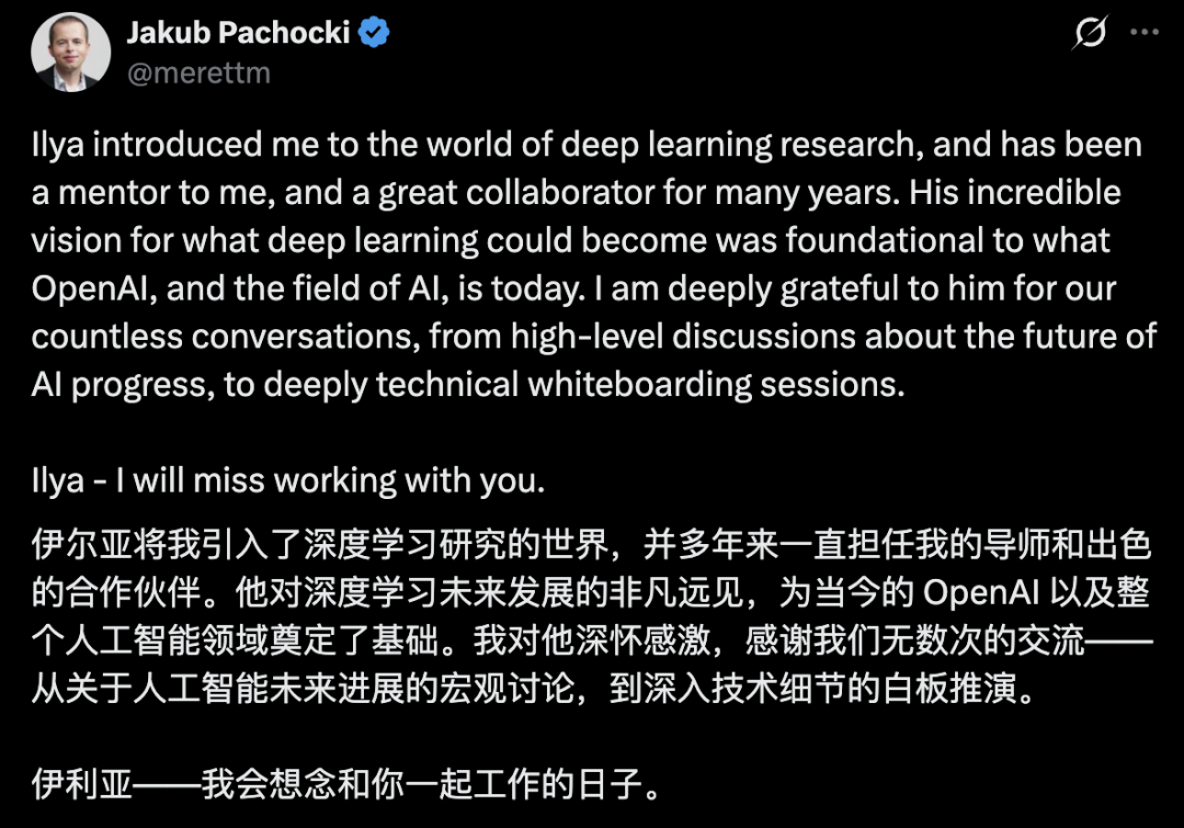Jakub在Ilya的推文下留言,称其为自己的导师和出色的合作伙伴,并称会想念和Ilya一起工作的日子。