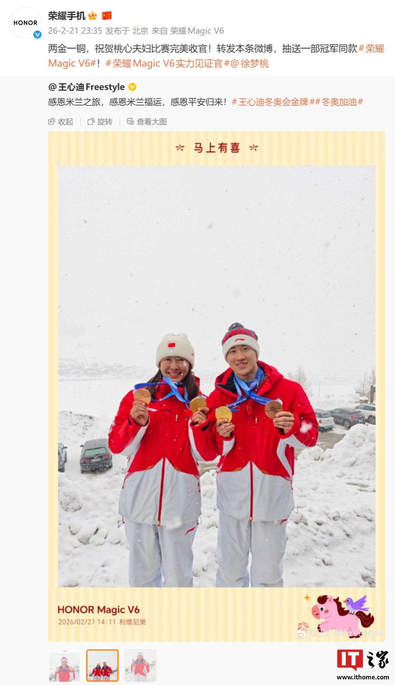 IT之家注意到,2016-2017 年自由式滑雪空中技巧世界杯冠军王心迪已经用上了荣耀 Magic V6,并晒出了使用该机拍摄的照片。