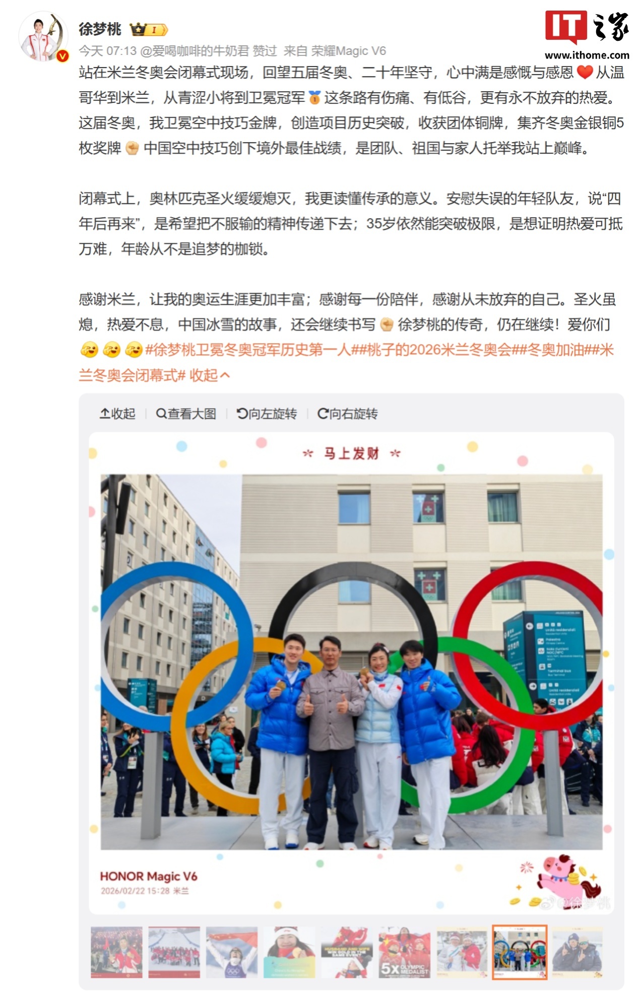 IT之家 2 月 23 日消息,博主 @WHYLAB 分享了荣耀 Magic V6 真机高清图,目前冬奥会冠军徐梦桃已经用上了这款新机。