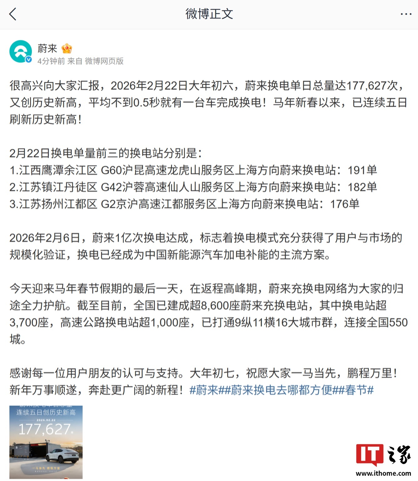 IT之家 2 月 23 日消息,蔚来换电再次刷新纪录:2026 年 2 月 22 日大年初六,蔚来换电单日总量达 177,627 次,又创历史新高,平均不到 0.5 秒就有一台车完成换电。