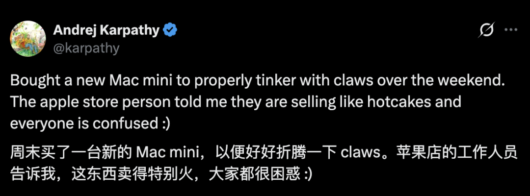 他在社交媒体上发帖:自己周末买了一台新Mac mini,准备好好折腾一番「Claws」。