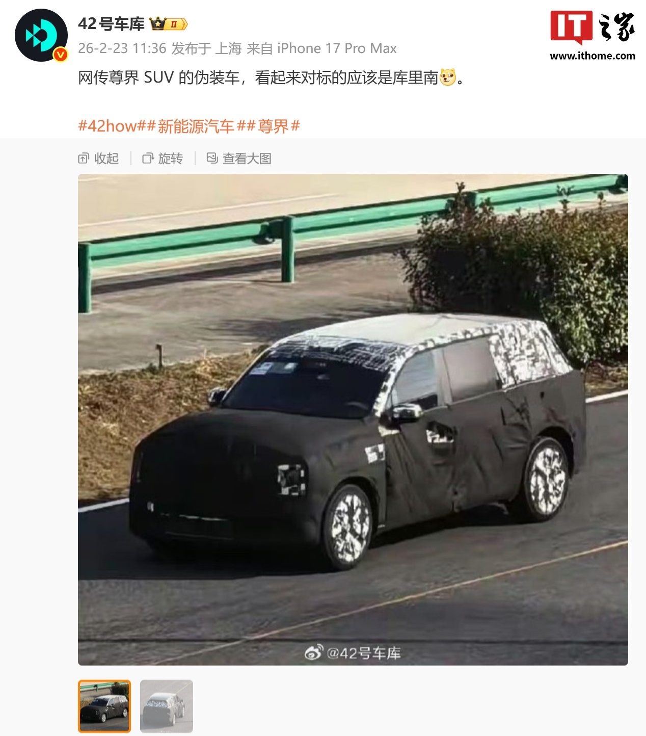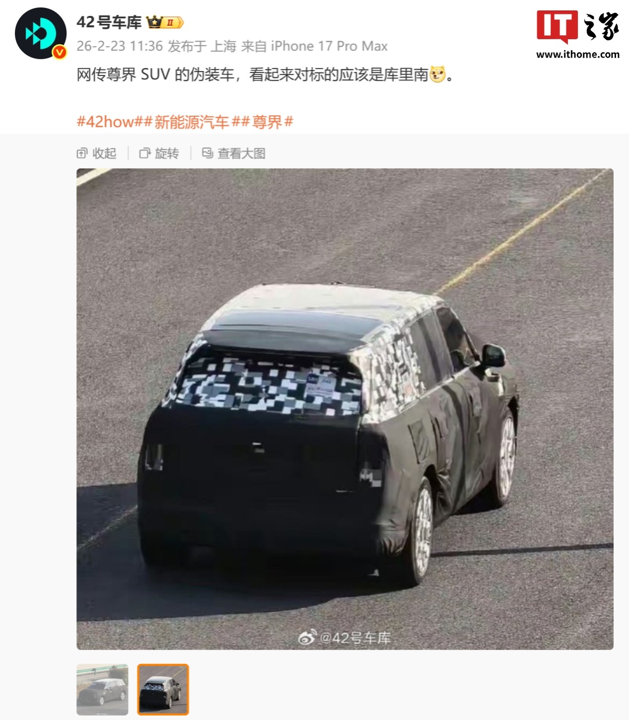 IT之家 2 月 23 日消息,博主 @42号车库 今日分享了鸿蒙智行尊界 SUV 的伪装车照片,称“看起来对标的应该是库里南”。