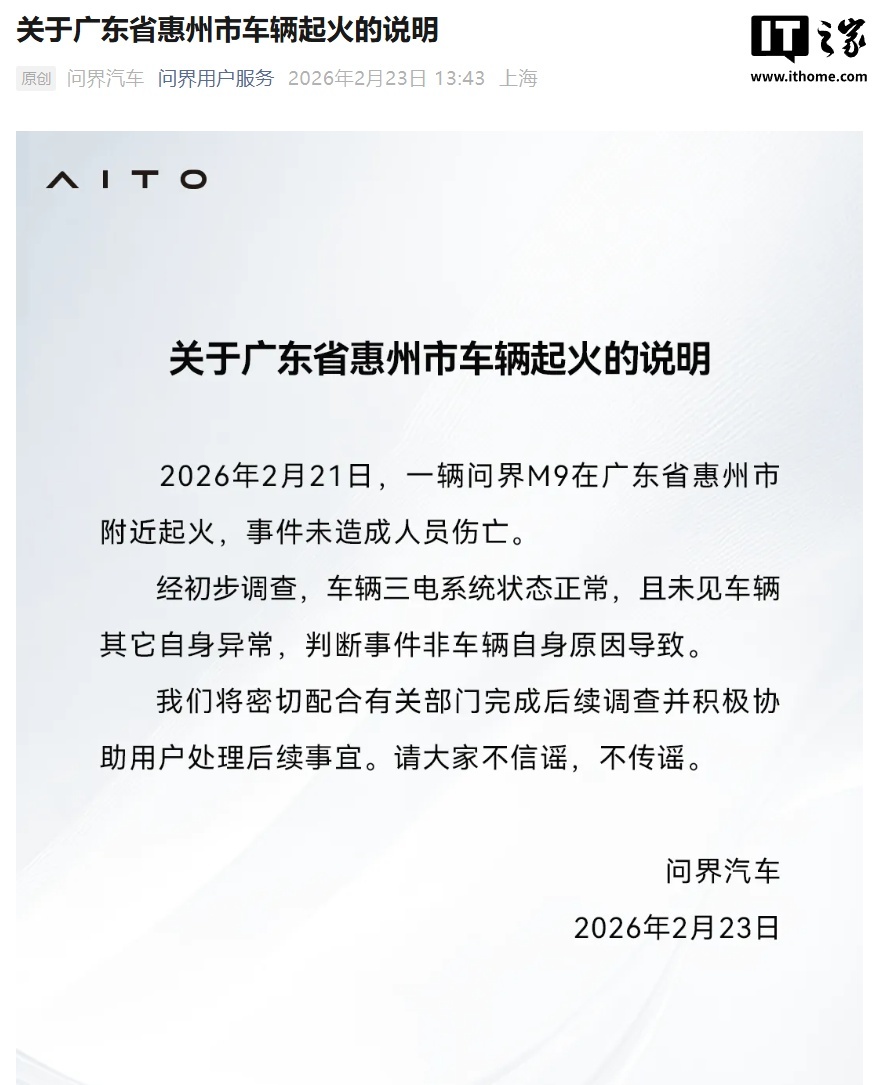 问界汽车回应惠州车辆起火:三电系统状态正常,未造成人员伤亡 IT之家 2 月 23 日消息,问界汽车今日发布关于广东省惠州市车辆起火的说明,IT之家附全文如下: 2026 年 2 月 21 日,一辆问界 M9 在广东省惠州市附近起火,事件未造成人员伤亡。 经初步调查,车辆三电系统状态正常,且未见车辆其它自身异常,判断事件非车辆自身原因导致。 我们将密切配合有关部门完成后续调查并积极协助用户处理后续事宜。请大家不信谣,不传谣。 Published by 风君子 独自遨游何稽首 揭天掀地慰生平 View all posts by 风君子